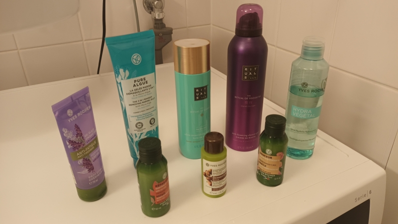Lot de 10 produits, de marques connues: gel apaisant pour les pieds; démaquillant; huile de douche; mousse de douche; eau micellaire; shampooing.