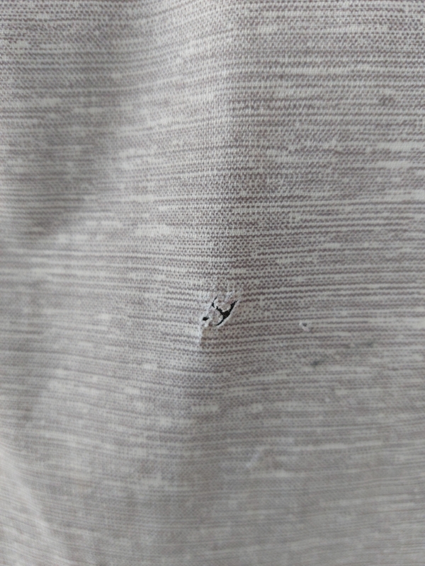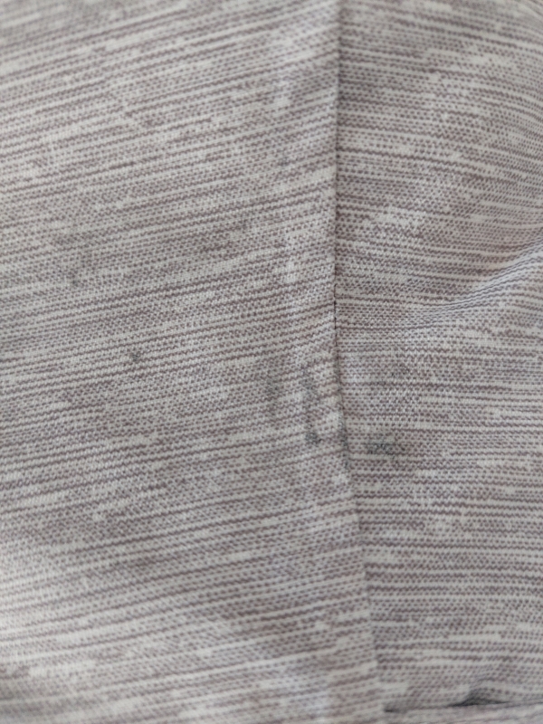 Anorak Decathlon Quechua Taille Medium Gris clair chiné- liserés violets Capuche détachable par pressions Léger accroc sur coude droit Tâches sur manche gauche Pour le reste : bon état Veste légère entre saisons, ne convient pas pour l'hiver