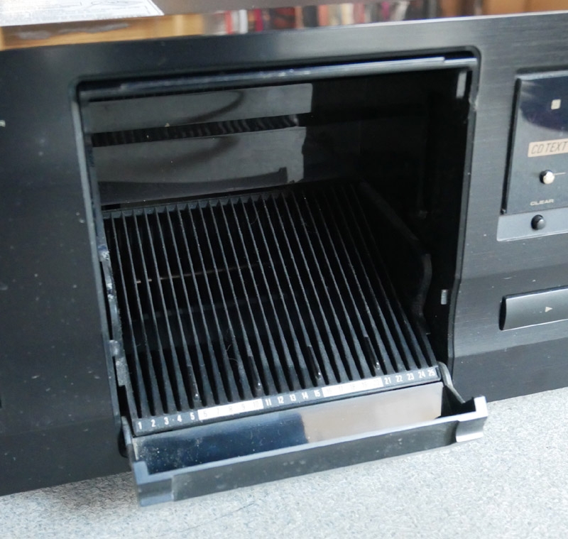 La mécanique fonctionne mais le laser à des ratés : je ne suis pas parvenu à le nettoyer. Mais comme je n'ai plus besoin de lire 25 CDs, je laisse cette tâche à son futur acquéreur...