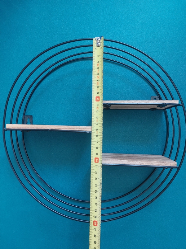 Petite étagère s'accrochant au mur par 2 vis (non fournies) En métal noir et bois Forme circulaire de 30 cm de diamètre A venir chercher à Jette